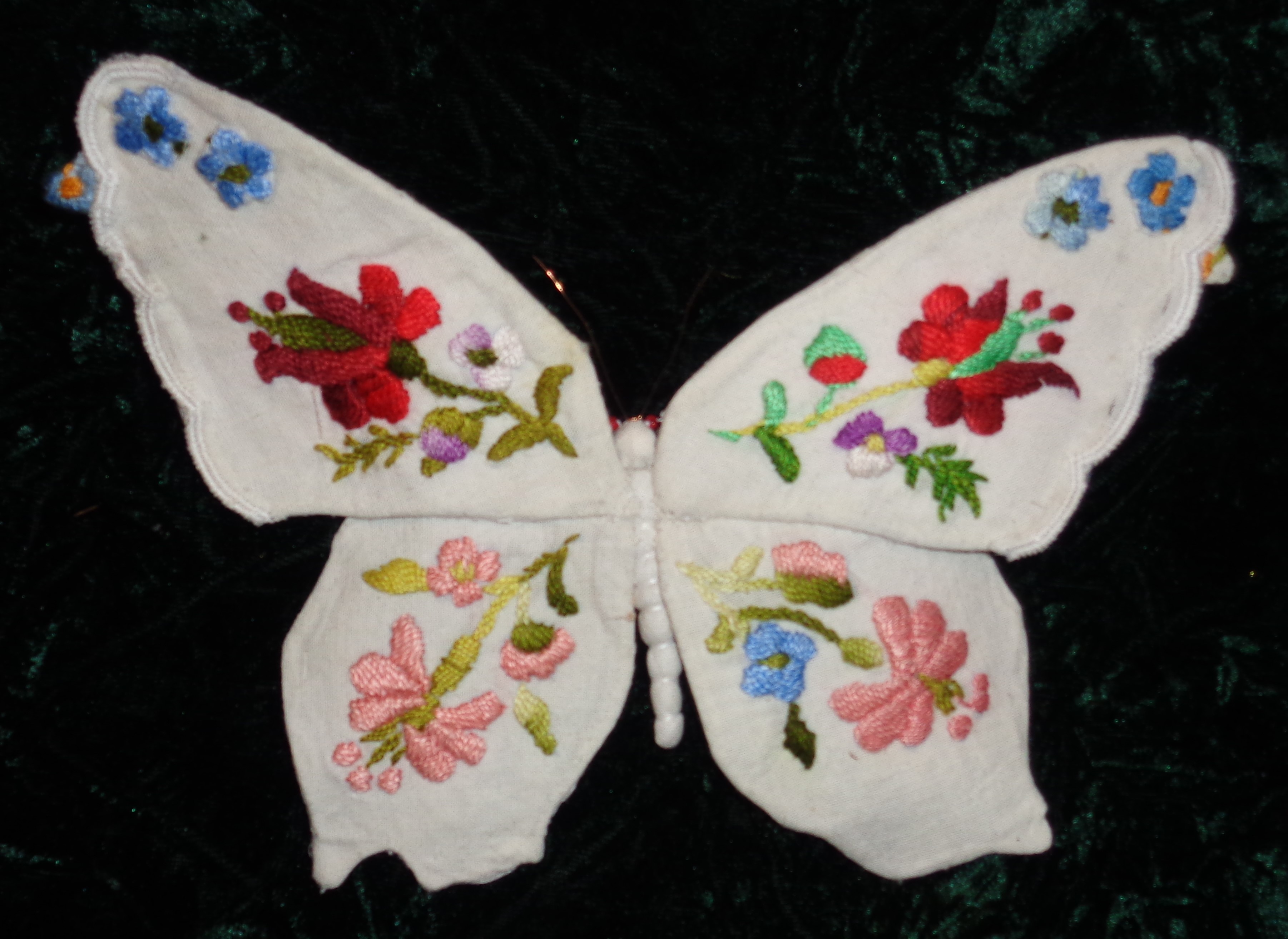 Butterfly in a Box, a hand embroidered table cloth was turned into a butterfly for a family business which uses butterflies as part of their logo.