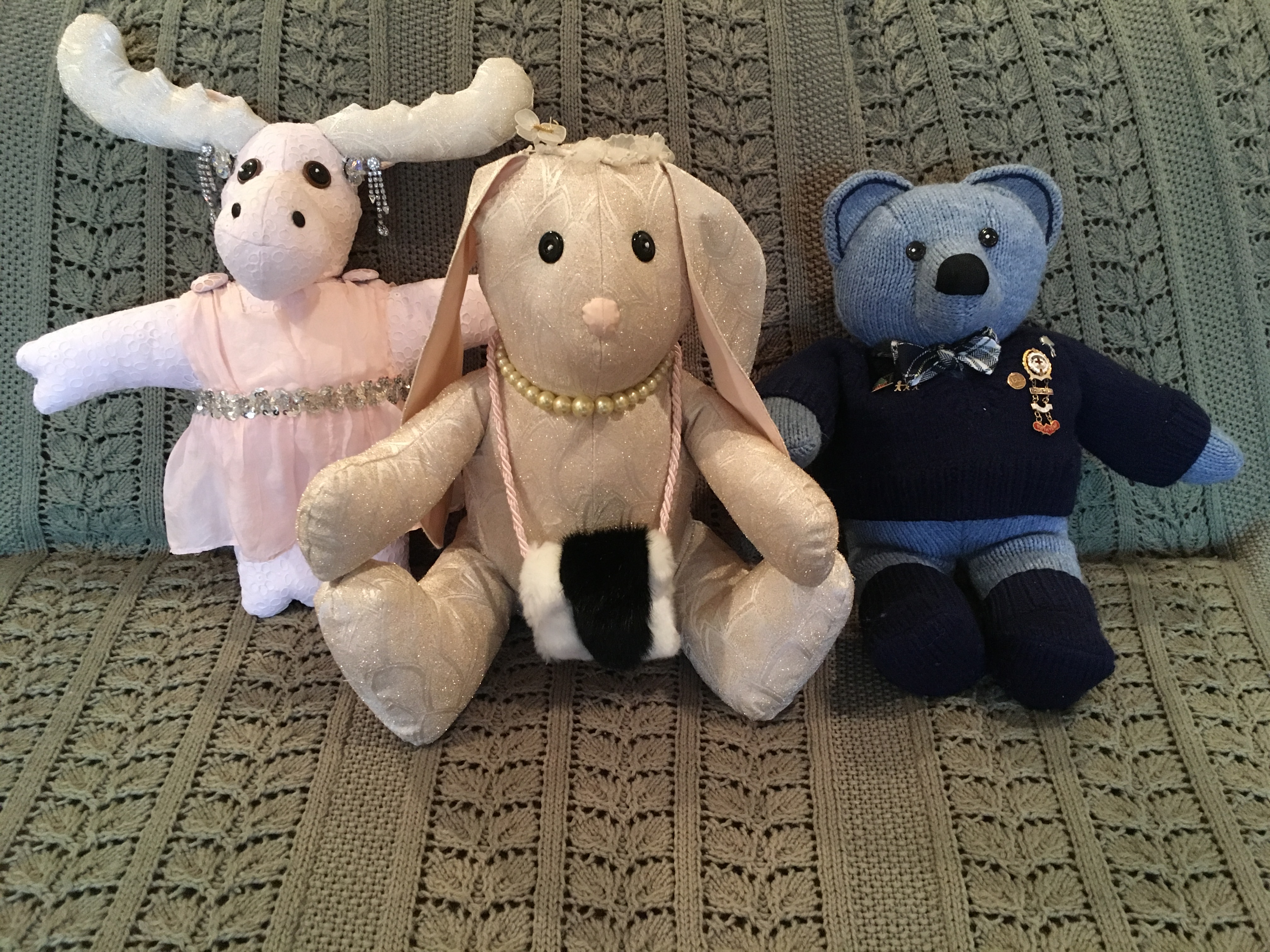 Donna’s Three, cloth from grandparents, memories of childhood adventures and very different personalities were used to recreate a set of Stuffies for this family. Photos of the original Stuffies were provided for reference.