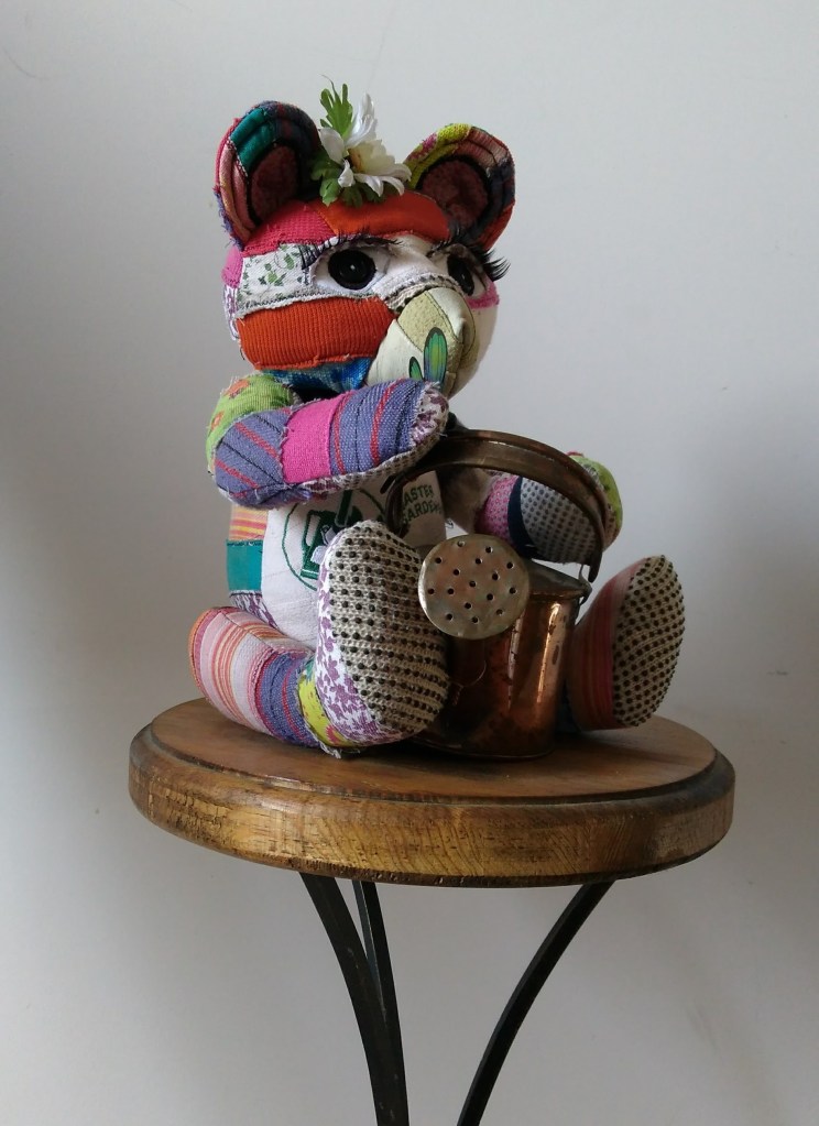 Curtains is a bear made from a few old curtains. There was a great deal of “fussy cutting” involved in creating this piece. Lining up stripes and making sure that pattern pieces were mirror imaged on the same flower contribute to the overall success of Curtains. My best compliment to date came when a complete stranger told me that Curtains reminded her of a friend. Turns out the friend was Curtain’s model.