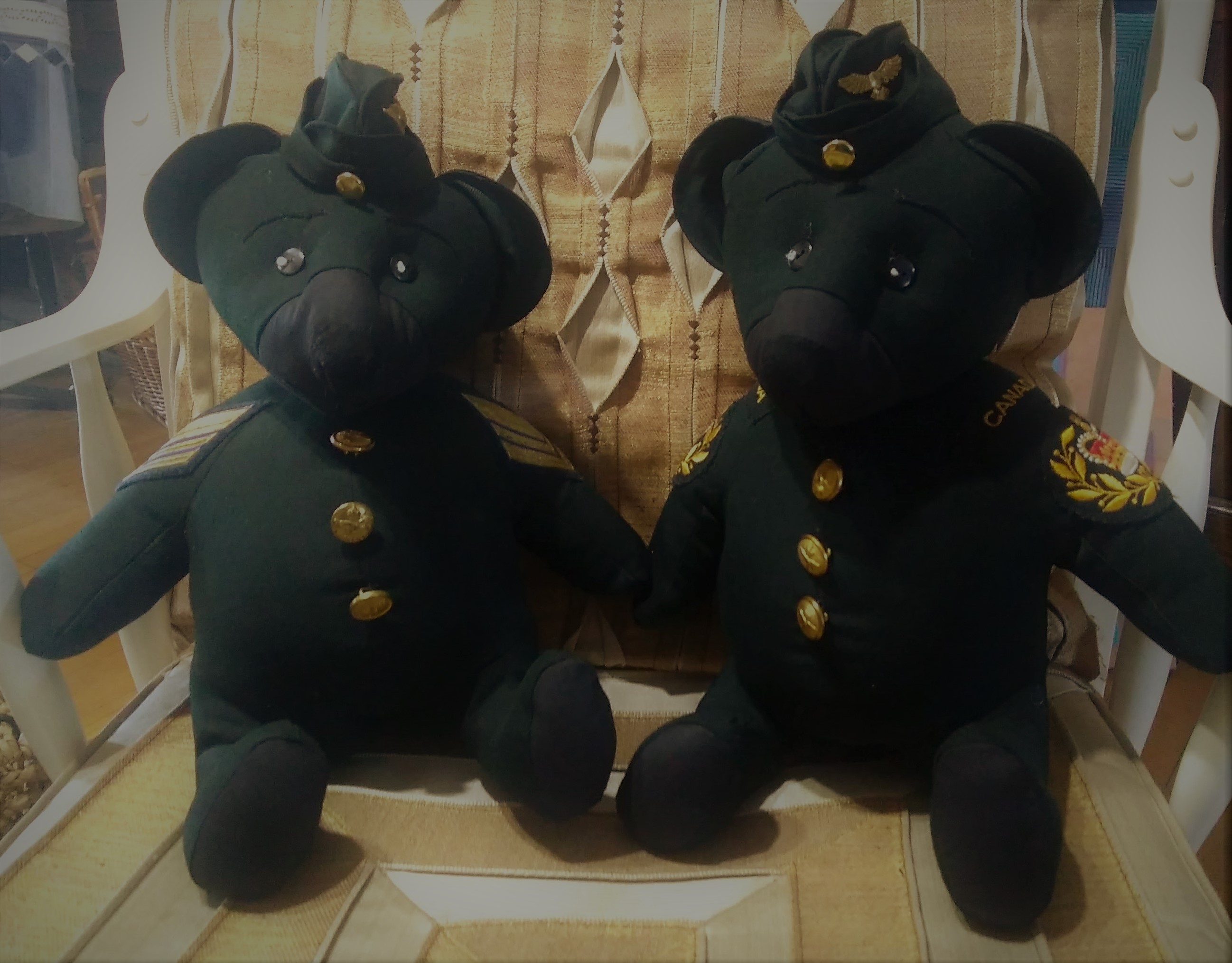 Gardenia, a community bear, was created from used garden gloves. She was designed to be used as a fundraiser. I really enjoyed the adventure of creating this bear for the community from materials collected by the community. Ted done twice, started as a Royal Canadian Air Force uniform from WWII. His hat, created from some pencil sketches found on line, is authentic to the spirit of the original Wedge Cap. It opens up to reveal a chin strap and ear covers.